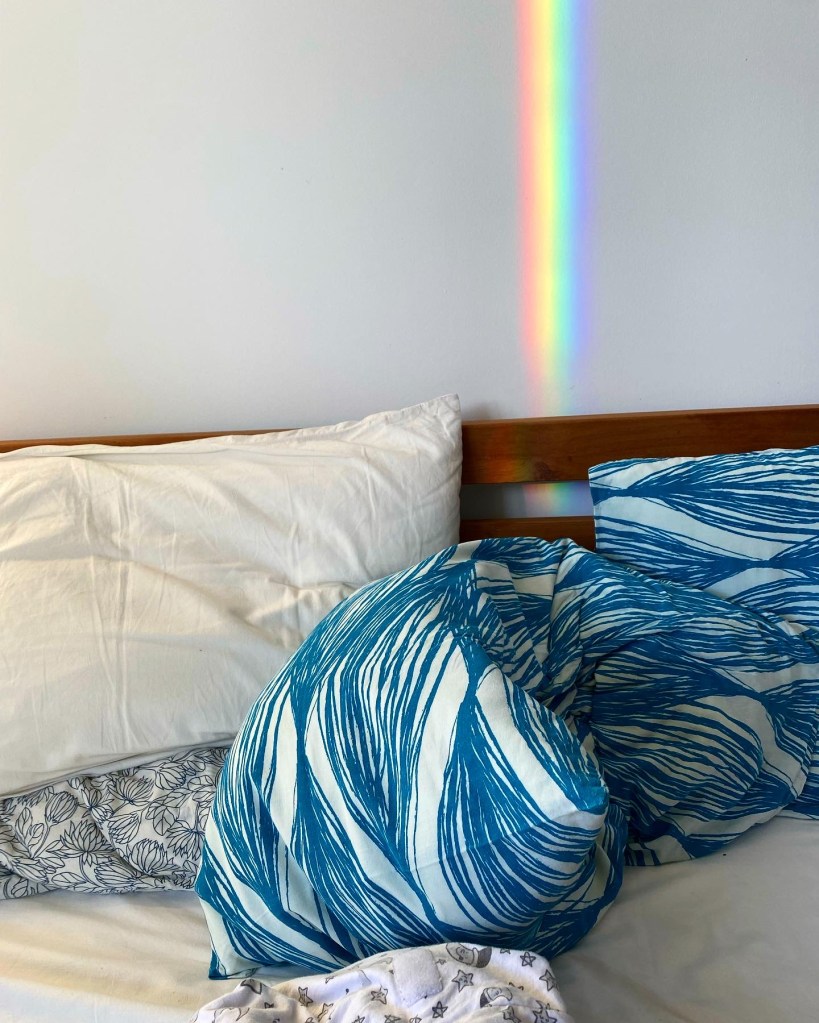 On his 6 month birthday, Frankie woke up beaming in our holiday home on Fuerteventura. I sat him on my bed in the pathway of a thick rainbow beam of light that appeared each morning across the room. He reached out to grab it, and looked up at me, smiling but confused, trying to work out what it was and why he couldn’t hold it in his hands. I walked to the corner of the room, to the tall bedroom window where the rainbow appeared from, seeing if I could work out what was casting the spell: It was the join between two pieces of glass. The windows had been attached together messily, little tiny cracks and marks in the glass either side of the join. It was a mistake, an error, that had created the rainbow.